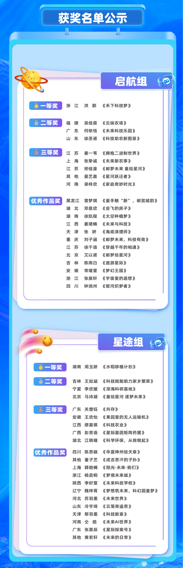 大賽開始以來,得到了社會各界的廣泛關(guān)注與參與,全國23個賽區(qū)共收到8.5萬幅參賽作品,從中推選出230幅優(yōu)秀作品參與全國總決賽的評比。經(jīng)過激烈的角逐和專家評委們的嚴(yán)格評審,評審出了“一等獎”2件、“二等獎”6件、“三等獎”10件、“優(yōu)秀作品獎”24件,共計42件獲獎作品。來自全國各地的參賽小藝術(shù)家們手執(zhí)畫筆,在方寸郵票上精心描繪未來科技世界的奇妙圖景,充滿想象力的作品不僅獲得各位評審專家的高度贊譽,更成為展現(xiàn)新時代少兒科學(xué)素養(yǎng)與創(chuàng)新活力的亮麗窗口。