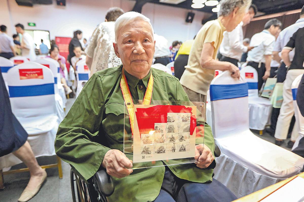 在上海四行倉庫抗戰(zhàn)紀(jì)念館隆重舉行的發(fā)行儀式上,主辦方向抗戰(zhàn)老戰(zhàn)士及家屬等贈(zèng)送了紀(jì)念郵品。 □許雨舟 攝影報(bào)道