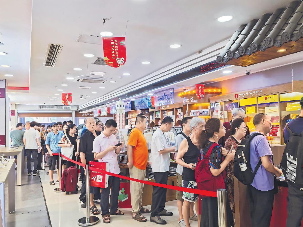 抗戰(zhàn)勝利80周年紀(jì)念郵票發(fā)行當(dāng)日,重慶市解放碑主題郵局排起了長隊(duì)?!跷很啊z影報(bào)道