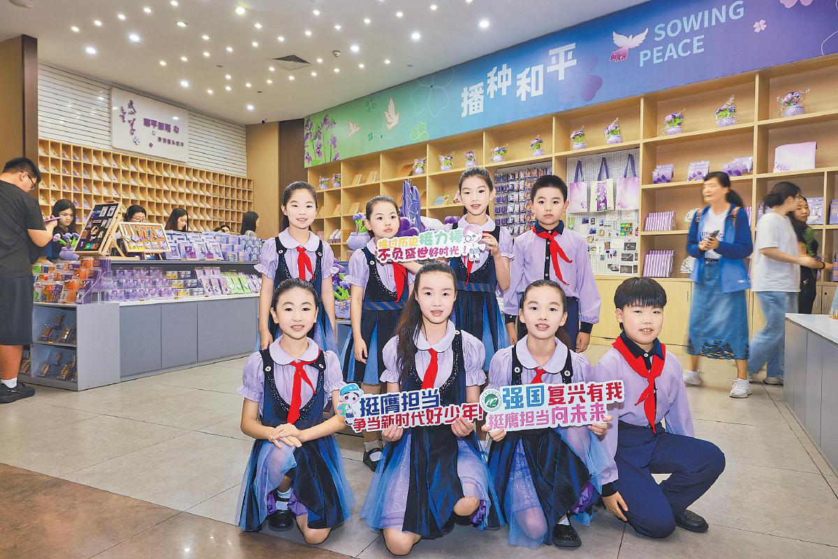9月3日下午,江蘇省郵政分公司聯(lián)合侵華日軍南京大屠殺遇難同胞紀(jì)念館舉辦抗戰(zhàn)勝利80周年紀(jì)念郵票發(fā)行儀式。圖為在活動(dòng)現(xiàn)場表演節(jié)目的學(xué)生代表來到和平郵局打卡留念。□柏濱豐 攝影報(bào)道