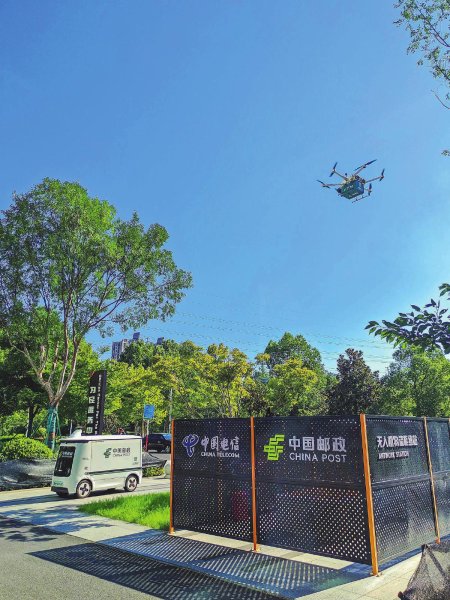 8月20日,在安徽省合肥市政務(wù)中心中國郵政無人機(jī)物流樞紐站,無人機(jī)啟程配送無人車送來的郵件。