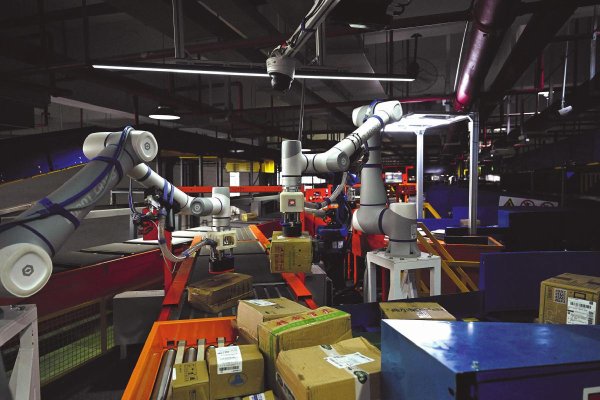 單臂供件機(jī)器人在抓取分揀快遞郵件。