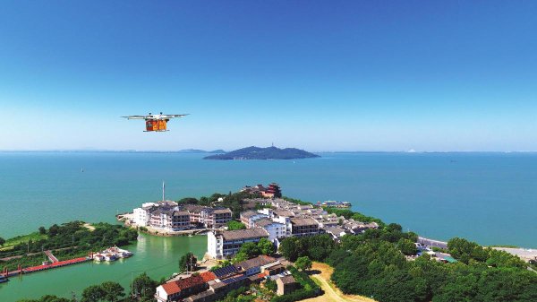 8月19日,在安徽省合肥市巢湖上空,無人機(jī)在配送快遞包裹(無人機(jī)照片)。