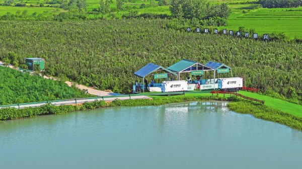 8月21日,在安徽省六安市霍邱縣元圩瓜果種植專業(yè)合作社,郵政無人車在拉運(yùn)郵政電商直播賣出的秋月梨(無人機(jī)照片)。
