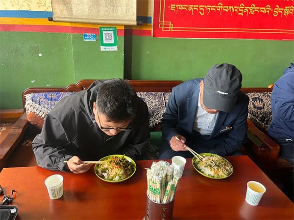 午飯時(shí)間,鄉(xiāng)政府旁的索多藏餐館里擠滿了來(lái)用餐的人。有觀光的游客,有像我們一樣到這里工作的外鄉(xiāng)人,還有本地的老百姓。記者和曲巴一起回憶起10年前在普瑪江塘只能吃面包、泡面的采訪經(jīng)歷。曲巴說(shuō):“現(xiàn)在鄉(xiāng)上開(kāi)了3家餐館,大家也能吃上熱乎乎的飯菜了?!庇浾唿c(diǎn)了一份青椒肉絲蓋飯,曲巴要了一份小白菜蓋飯。我們吃得一干二凈!