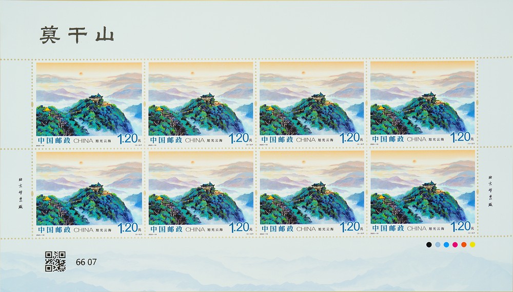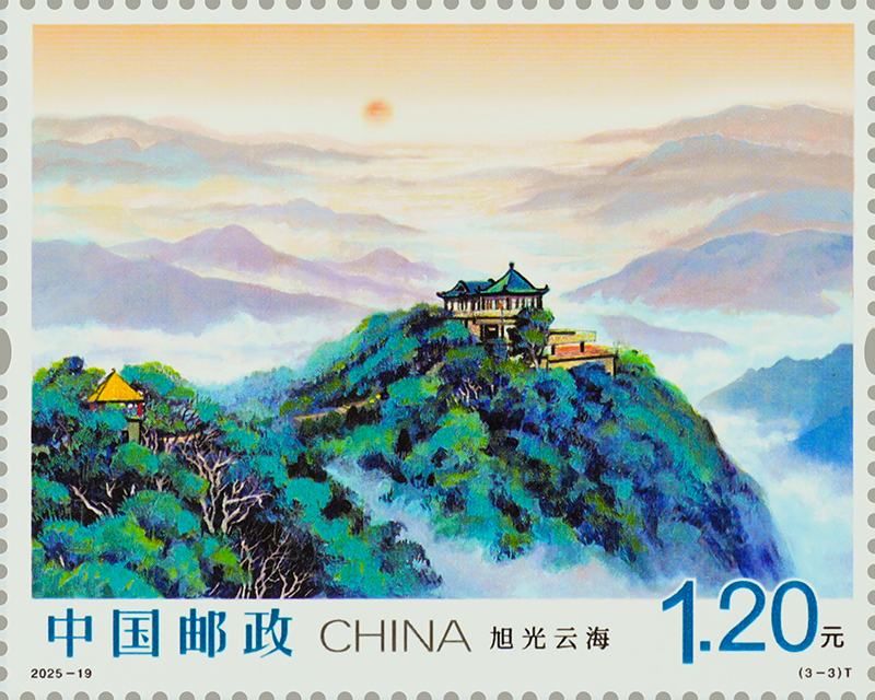第三枚“旭光云?!?,描繪了莫干山的日出景象。該枚郵票定格了莫干山旭日東升的壯麗景象,旭光臺(tái)作為莫干山觀賞日出的絕佳觀景臺(tái),將天地交輝的盛景盡收眼底。遠(yuǎn)山如黛,云濤似海,萬(wàn)道金芒為連綿山巒披上錦袍,昭示著此刻的莫干山正以更輝煌的姿態(tài)擁抱嶄新的未來(lái)。